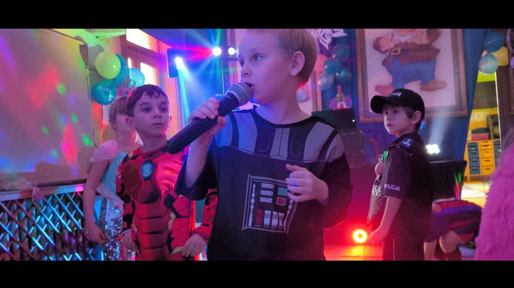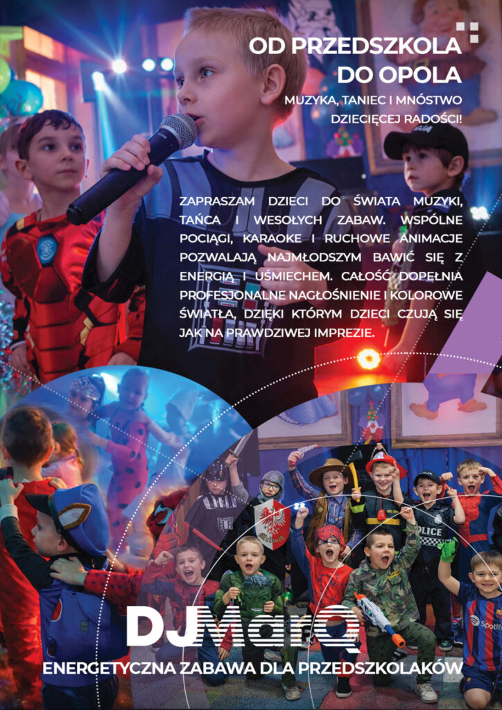ZAPRASZAM DZIECI DO ŚWIATA MUZYKI, TAŃCA I WESOŁYCH ZABAW. WSPÓLNE POCIĄGI, KARAOKE I RUCHOWE ANIMACJE POZWALAJĄ NAJMŁODSZYM BAWIĆ SIĘ Z ENERGIĄ I UŚMIECHEM. CAŁOŚĆ DOPEŁNIA PROFESJONALNE NAGŁOŚNIENIE I KOLOROWE ŚWIATŁA, DZIĘKI KTÓRYM DZIECI CZUJĄ SIĘ JAK NA PRAWDZIWEJ IMPREZIE.