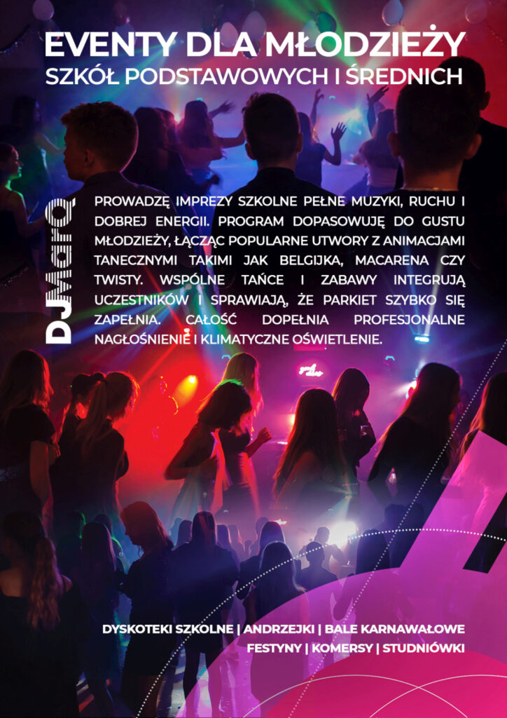 PROWADZĘ IMPREZY SZKOLNE PEŁNE MUZYKI, RUCHU I DOBREJ ENERGII. PROGRAM DOPASOWUJĘ DO GUSTU MŁODZIEŻY, ŁĄCZĄC POPULARNE UTWORY Z ANIMACJAMI TANECZNYMI TAKIMI JAK BELGIJKA, MACARENA CZY TWISTY. WSPÓLNE TAŃCE I ZABAWY INTEGRUJĄ UCZESTNIKÓW I SPRAWIAJĄ, ŻE PARKIET SZYBKO SIĘ ZAPEŁNIA. CAŁOŚĆ DOPEŁNIA PROFESJONALNE NAGŁOŚNIENIE I KLIMATYCZNE OŚWIETLENIE.