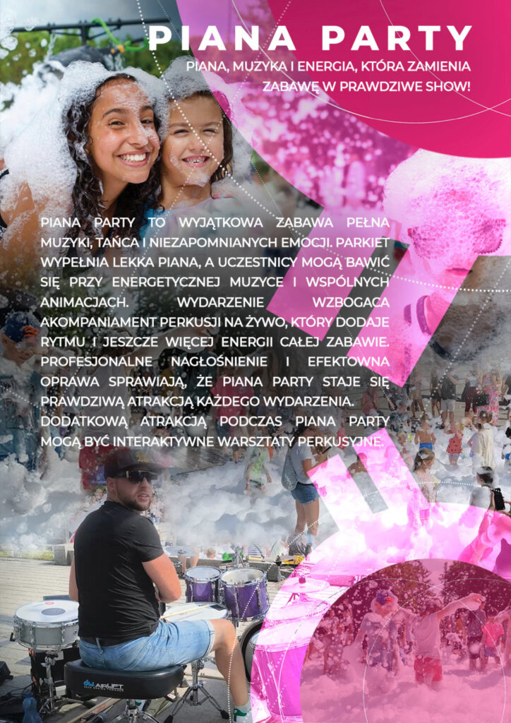 WYDARZENIE MOŻE WZBOGACIĆ DOATKOWY AKOMPANIAMENT PERKUSJI NA ŻYWO, KTÓRY DODAJE RYTMU I JESZCZE WIĘCEJ ENERGII CAŁEJ ZABAWIE. PROFESJONALNE NAGŁOŚNIENIE I EFEKTOWNA OPRAWA SPRAWIAJĄ, ŻE PIANA PARTY STAJE SIĘ PRAWDZIWĄ ATRAKCJĄ KAŻDEGO WYDARZENIA.