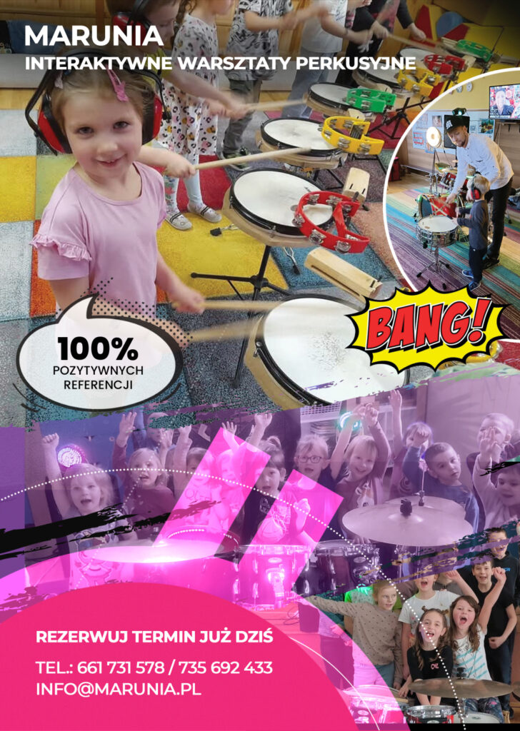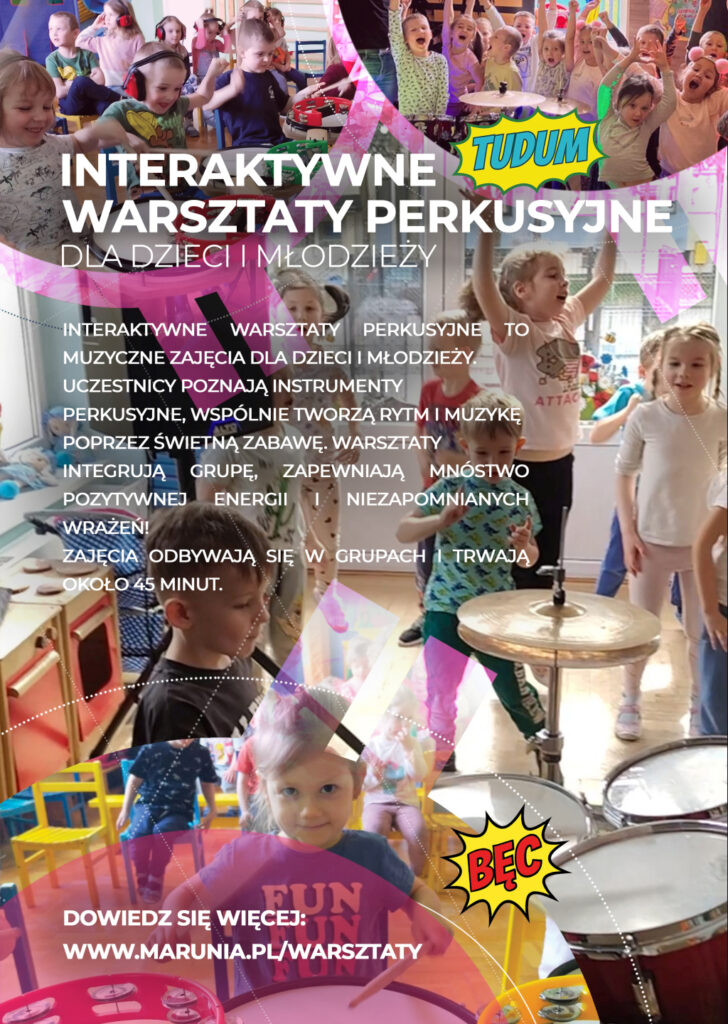 AUTORSKIE WARSZTATY PERKUSYJNE TO INTERAKTYWNE SPOTKANIE Z MUZYKĄ, RYTMEM I ENERGIĄ SCENY. ZAJĘCIA ŁĄCZĄ ELEMENTY EDUKACYJNE Z DOŚWIADCZENIEM WYSTĘPU NA ŻYWO, DAJĄC UCZESTNIKOM MOŻLIWOŚĆ AKTYWNEGO UDZIAŁU, A NIE BIERNEGO OGLĄDANIA.